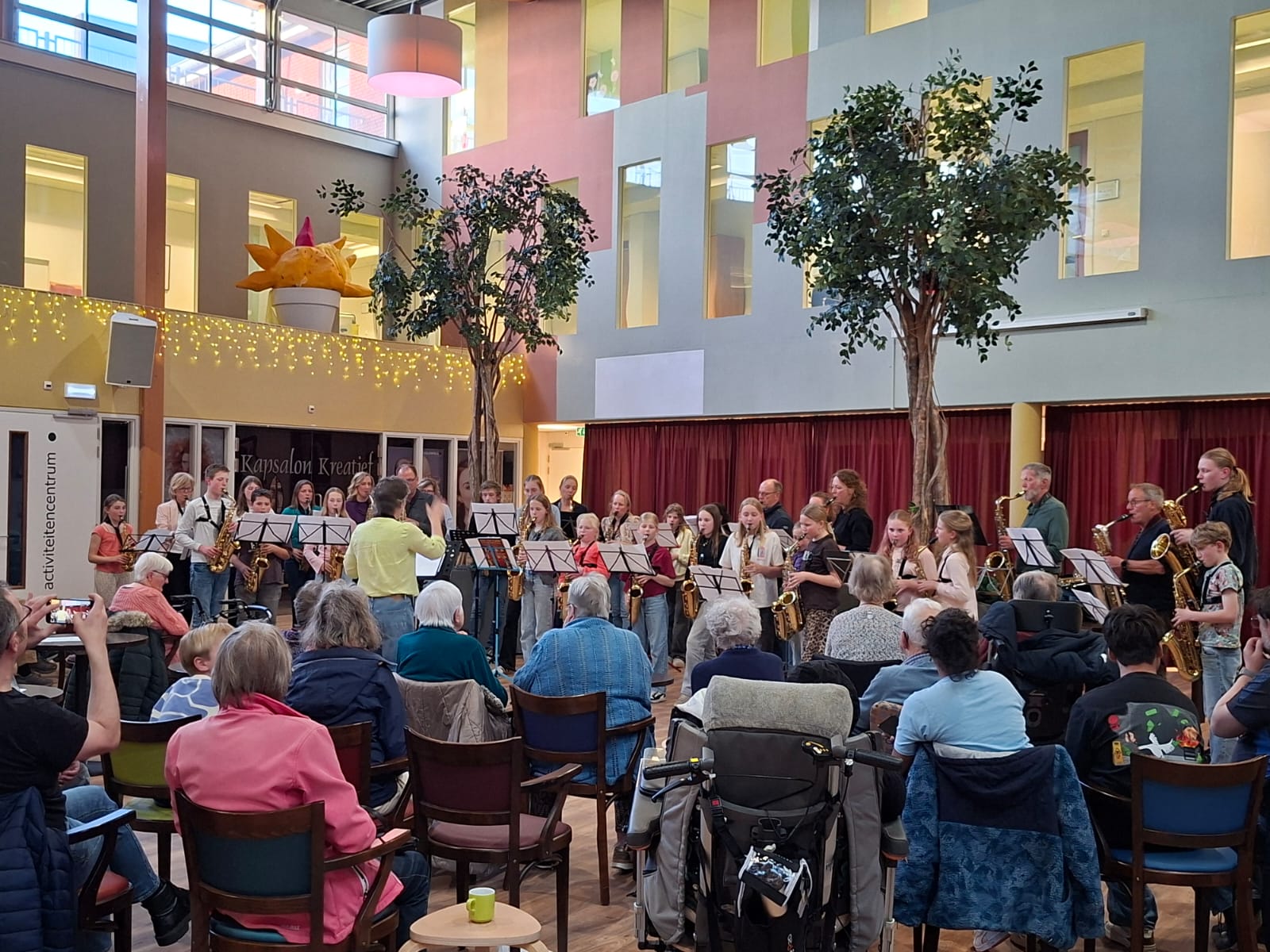 Op donderdag 16 april werd het Dorpsplein van het Zonnehuis omgetoverd tot een waar saxofoonwalhalla. Meer dan 30 saxofoonleerlingen van Het KunstKwartier, onder leiding van docenten Mathilde Leemhuis en Jildou Renema, gaven een afwisselend concert voor bewoners, familie en vrienden.